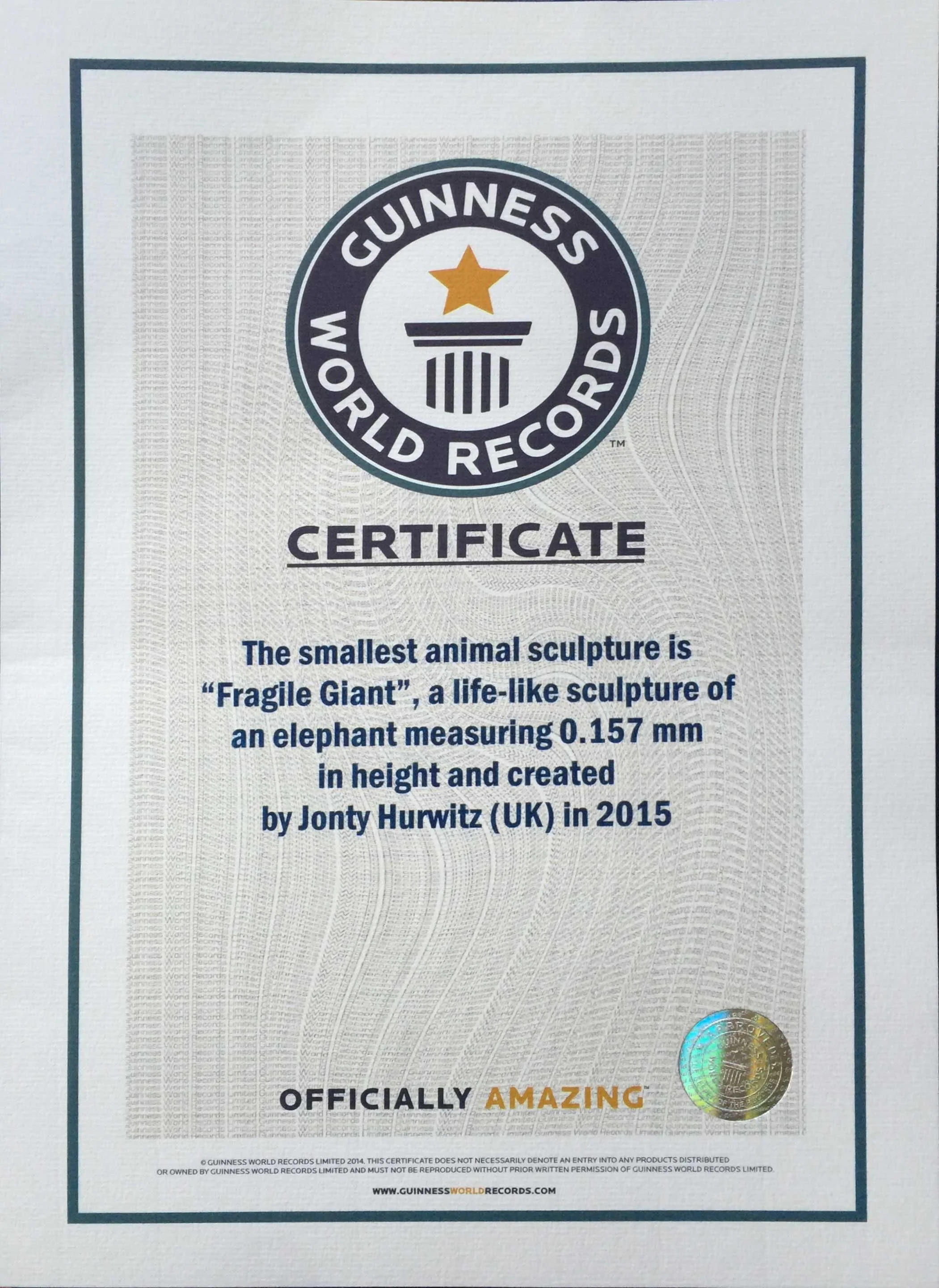 The smallest animal sculpture is "Fragile Giant", a life-like sculpture of an elephant measuring 0.157mm in height and created by Jonty Hurwitz (UK) in 2015.