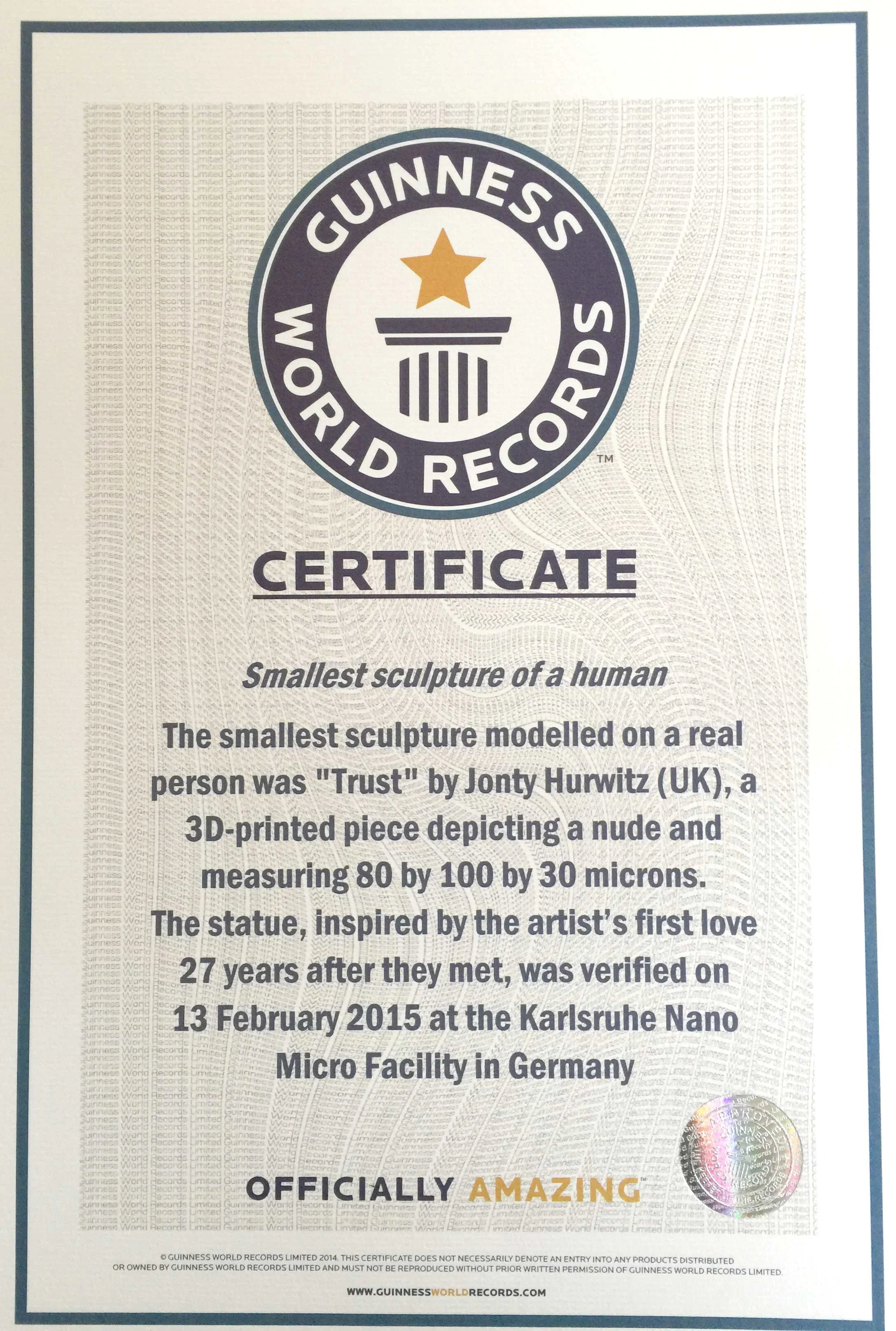 The smallest sculpture modelled on a real person was "Trust" by Jonty Hurwitz (UK), a 3D-printed piece depicting a nude and measuring 80 by 100 by 30 microns. The statue, inspired by the artist's first love 27 years after they met, was verified on 13 February 2015 at the Karlsruhe Nano Micro Facility in Germany.