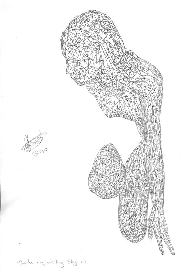 I find myself regularly questioning the nature of reality as I journey through life. In this series of sketches I draw an imaginary woman called V3 as she rotates in space and time with her body passing through a veil of non-existence.