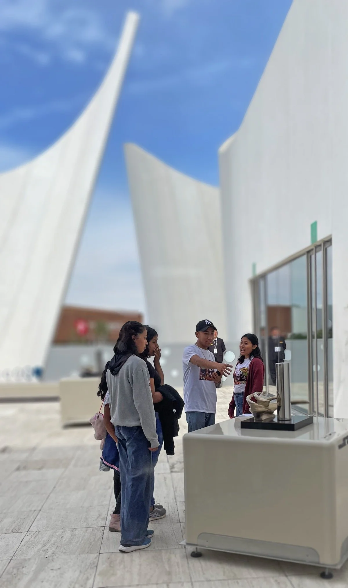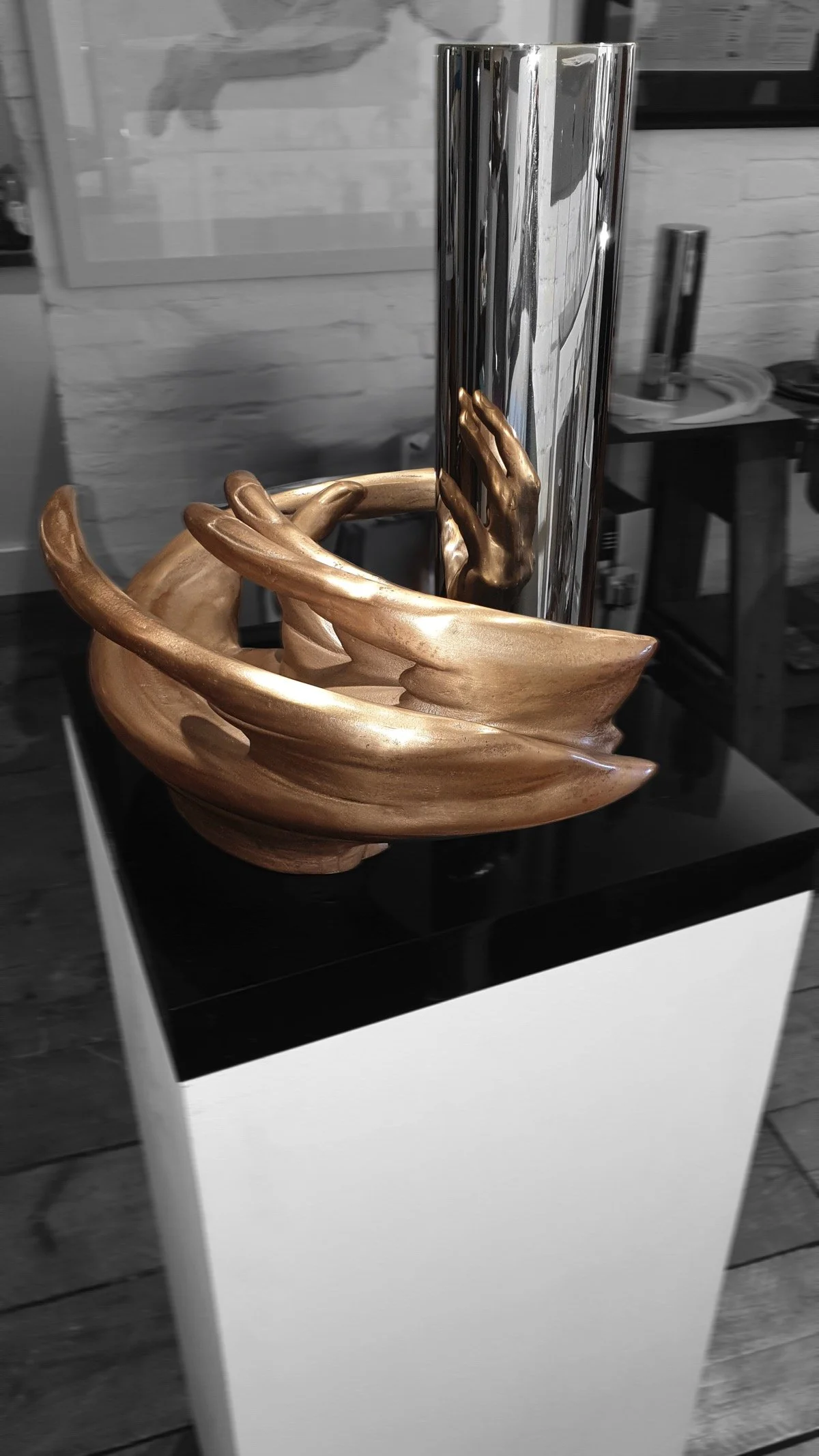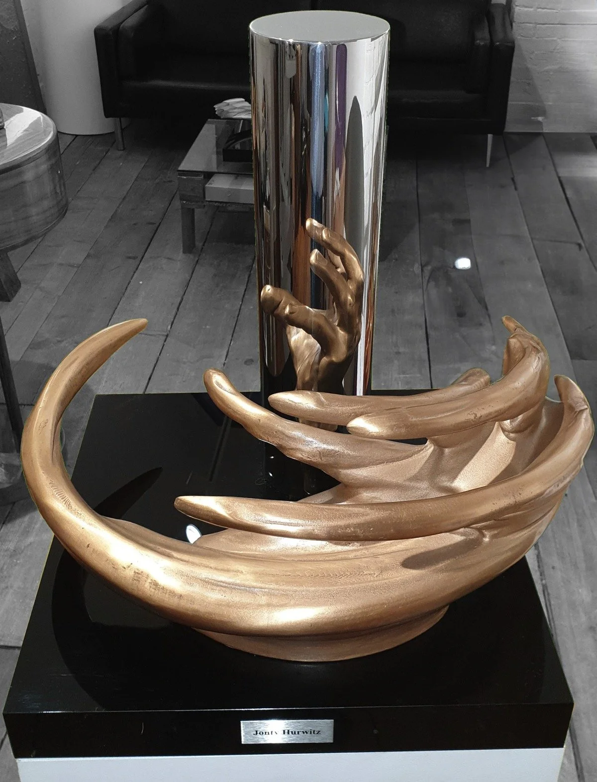 An art sculpture displaying a large metallic cylinder with a bronze hand reaching out of it, and a bronze crescent-shaped element on a black pedestal with a plaque labeled 'Jont Hurwitz', in a gallery setting.